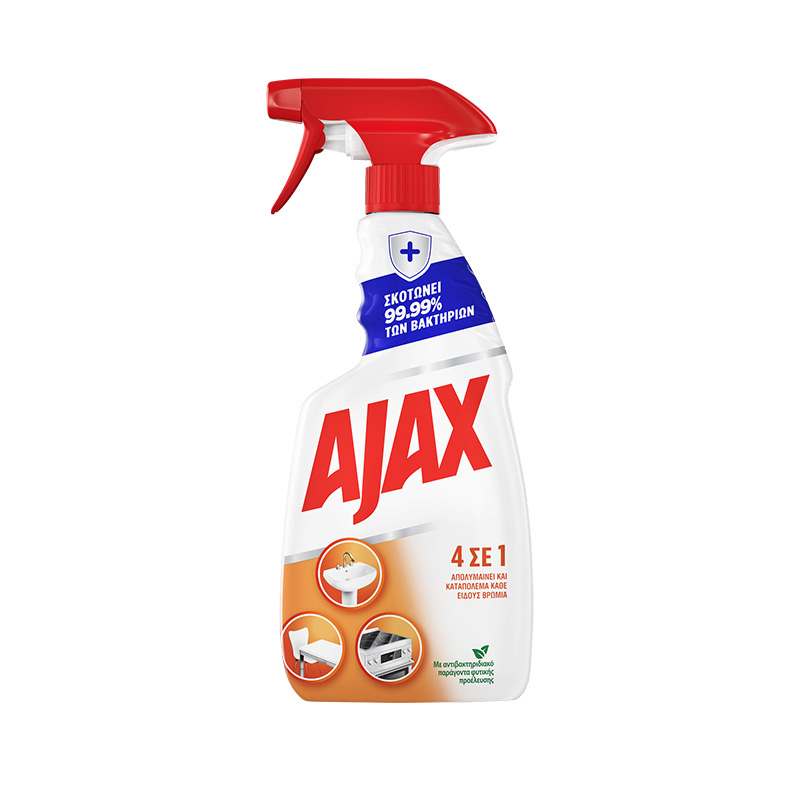 Το Ajax 4 σε 1 καθαρίζει όλες τις πλενόμενες επιφάνειες απολυμαίνοντας τις 100% , καταπολεμώντας κάθε είδους βρωμιά. Χάρη στην ισχυρή του σύνθεση καθαρίζει άμεσα και σε βάθος, χαρίζει λάμψη στις επιφάνειες ενώ παράλληλα τις απολυμαίνει χωρίς χλώριο. Έχει ευχάριστο άρωμα και σέβεται τις επιφάνειες. Είναι φιλικό προς το περιβάλλον και βρήσκεται σε μορφή αντλίας.